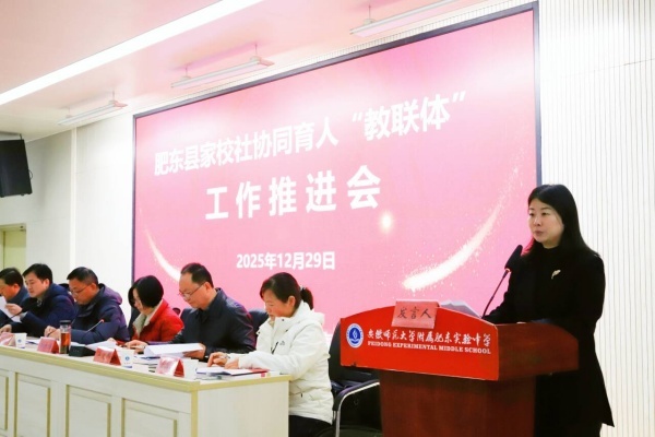 2025年12月26日上午,肥东县学校家庭社会协同育人“教联体”建设工作推进会在安师大附属肥东实验中学隆重召开。副县长牛张勇出席会议并讲话,县教体局党委书记、局长黄庆梅主持会议。县相关职能部门、各乡镇(园区)分管负责人,全县中小学、幼儿园负责人及专家代表等参加会议。肥东县实验幼儿园教育集团党支部书记、总园长阚艳艳以示范校代表身份受邀参会,向全县教育同仁及各相关单位汇报家园社协同育人的实践成果。