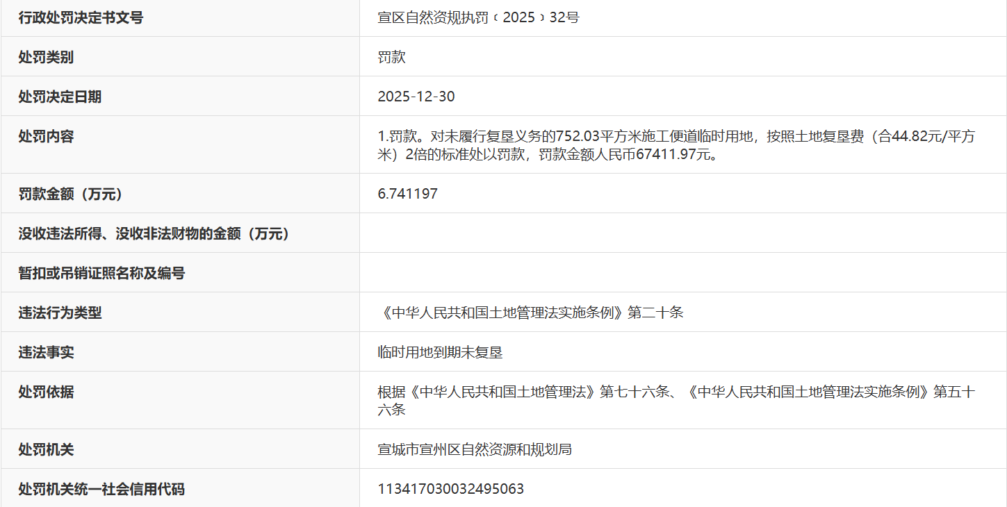 近日,据“信用安徽”公开披露行政处罚信息,因临时用地到期未复垦,宣城市宣州区社会福利院被处以罚款6.741197万元。行政处罚决定书文号是宣区自然资规执罚﹝2025﹞32号。