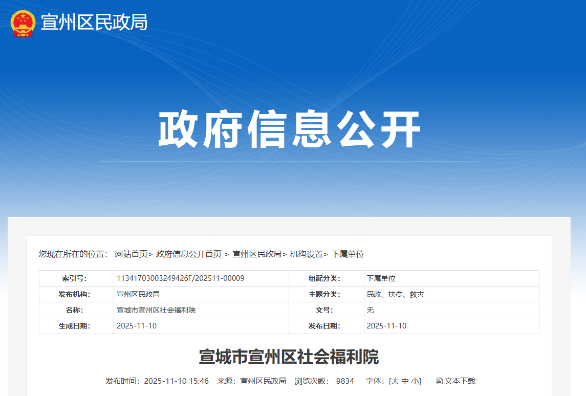 据“宣州区民政局”信息显示,宣州区社会福利院成立于1983年6月,隶属于宣州区民政局公益一类事业单位,作为一所综合型社会福利机构,主要为城区三无老人和孤弃儿童提供集中供养服务,并授权办理孤儿(弃婴)收养登记工作;同时为响应社会化养老服务需要,自1998年起为老年群众提供有偿代养服务。单位根据工作职能分设行管部、供养部和代养部,实行8小时工作制和24小时值班制。