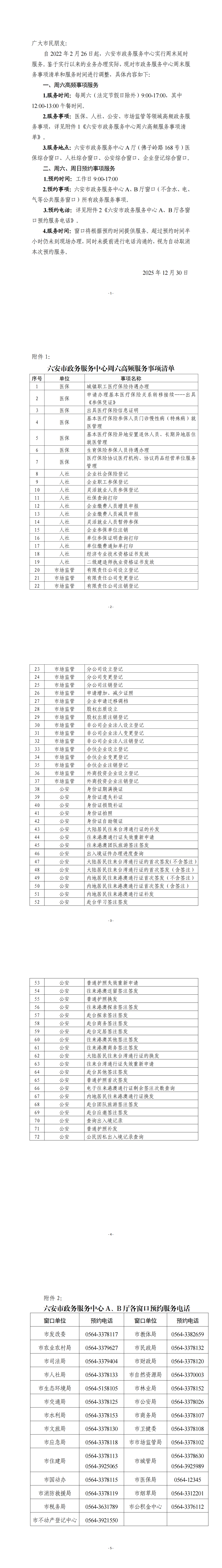自2022年2月26日起,六安市政务服务中心实行周末延时服务。鉴于实行以来的业务办理实际,现对市政务服务中心周末服务事项清单和服务时间进行调整,具体内容如下: