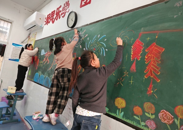 教室内,大家分工协作、默契配合,一派热火朝天的景象。老师们精准把控美化方向,引导学生和家长融入班级文化特色;家长们充分发挥动手优势,剪纸、挂灯笼、贴窗花、布置主题黑板报,动作娴熟利落;同学们则化身“创意小达人”,将精心制作的手工作品、元旦贺卡点缀在教室各个角落,用鲜艳的色彩和灵动的创意,让教室焕发出勃勃生机。有的班级以“童趣新年”为主题,张贴了充满童真的绘画作品;有的班级融入传统文化元素,悬挂起寓意吉祥的中国结和红灯笼;还有的班级打造了“梦想墙”,写下师生对新年的美好期许。