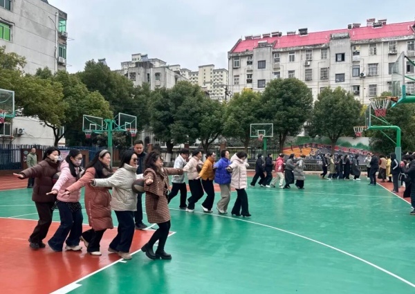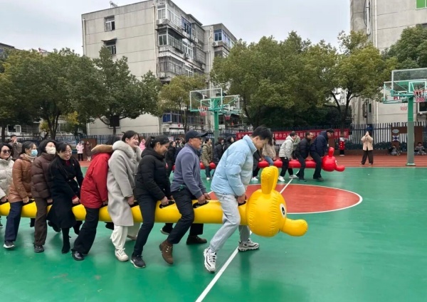 “蜈蚣运球”则充满了欢声笑语与信任温情。参赛教师排成长长的队伍,像一条灵活协作的蜈蚣,彼此间夹着彩球,在欢声笑语中蜿蜒前行。他们小心翼翼地保持平衡,默契配合,既要防止彩球掉落,又要争取最快速度。这别开生面的游戏不仅考验着团队协作,更让团结与快乐如暖流般在校园里传递,为新的一年拉开了充满活力与希望的序幕。