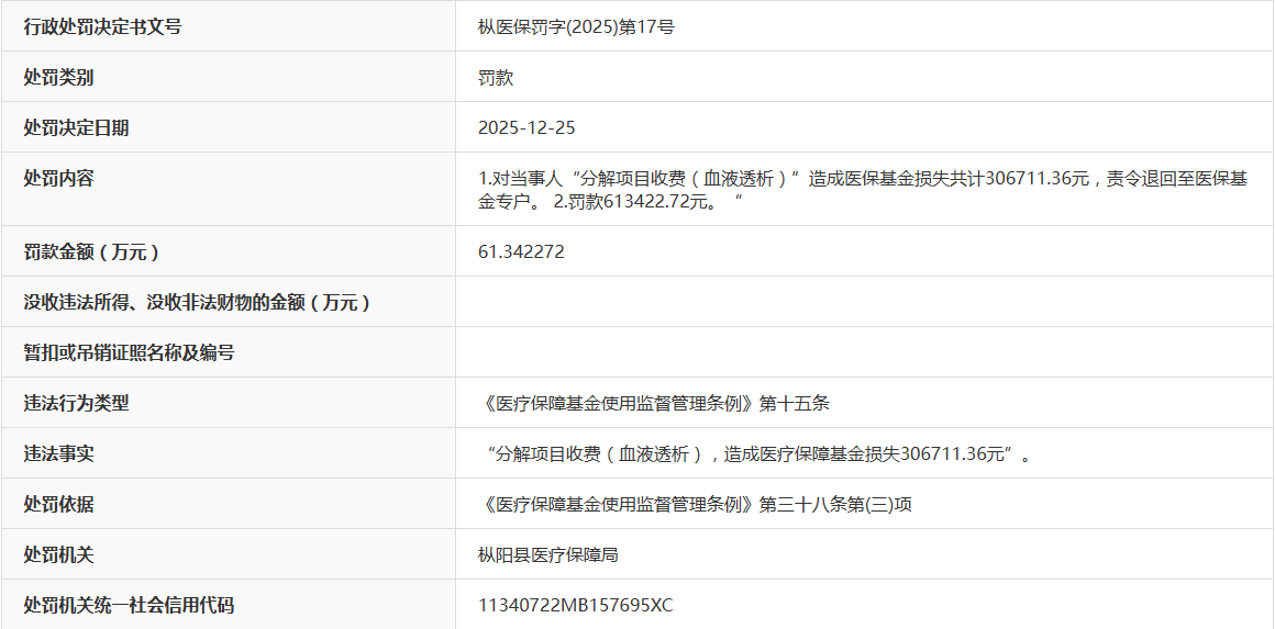 据枞医保罚字(2025)第17号公开处罚信息显示,枞阳华瑞医院分解项目收费(血液透析),造成医疗保障基金损失306711.36元。该行为违反了《医疗保障基金使用监督管理条例》第十五条。