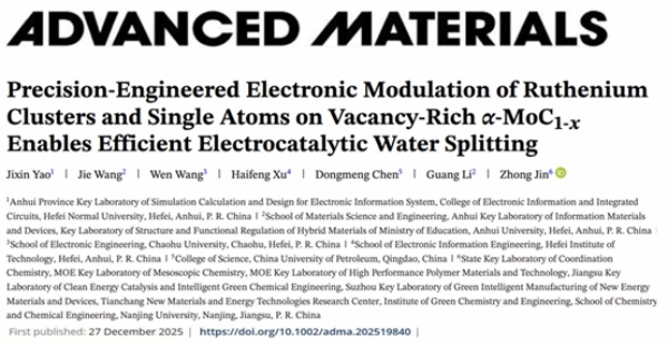 近日,合肥师范学院电子信息与集成电路学院青年教师姚吉鑫及其合作团队在精密工程化电子调控核心技术方面取得突破性研究进展,相关研究成果以“Precision-Engineered Electronic Modulation of Ruthenium Clusters and Single Atoms on Vacancy-Rich α-MoC1-x Enables Efficient Electrocatalytic Water Splitting”为题,发表于材料科学顶级期刊《Advanced Materials》(自然指数期刊,中国科学院大类一区Top期刊,IF=26.8)。电子信息与集成电路学院姚吉鑫博士为第一作者,合肥师范学院为第一署名单位。