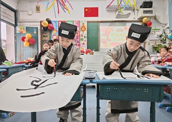 活动现场,各班教室经过师生精心布置,气球、彩带、灯笼等装饰元素随处可见,充满了喜庆的新年气息。联欢会上,同学们各展所长、自信登台,节目形式丰富多样、创意十足,赢得了现场师生的阵阵掌声。动感十足的轮滑表演中,小选手们身姿灵活、动作流畅,展现出蓬勃的运动活力;书法现场展示环节,小书法家们凝神静气、挥毫泼墨,一笔一画间尽显对中华传统文化的热爱与传承,一幅幅工整美观的书法作品赢得满堂喝彩;自创情景剧中,同学们凭借生动的演技、贴合校园生活的剧情,传递出童真童趣与成长感悟;心理健康游戏环节更是将活动气氛推向高潮,师生们积极参与、默契配合,在轻松愉快的互动中释放压力、增进情谊,充分展现了四河学子阳光开朗、团结协作的精神风貌。