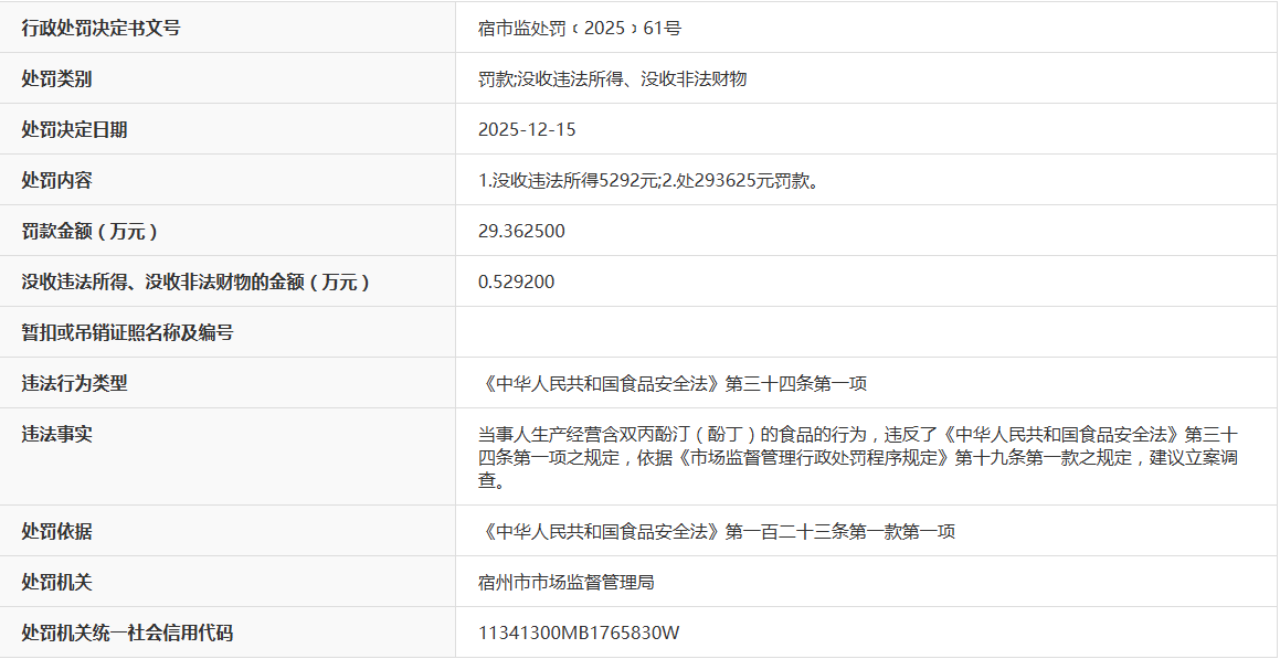 近日,据“信用安徽”公开披露行政处罚信息,因生产经营含双丙酚汀(酚丁)的食品,安徽益美康食品有限公司被罚没298917元。行政处罚决定书文号是宿市监处罚﹝2025﹞61号。