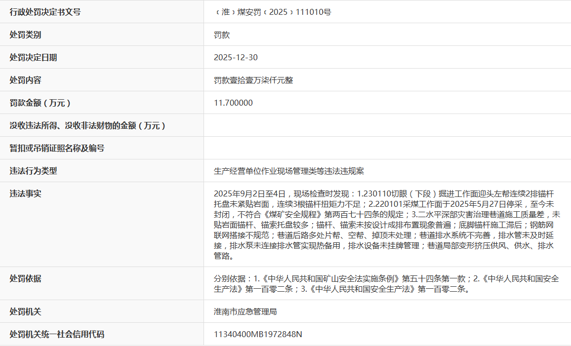 近日,据“信用安徽”公开披露行政处罚信息,因生产经营单位作业现场管理类等违法违规,中煤新集能源股份有限公司新集二矿被处以罚款11.7万元。行政处罚决定书文号是﹝淮﹞煤安罚﹝2025﹞111010号。