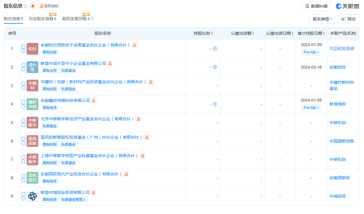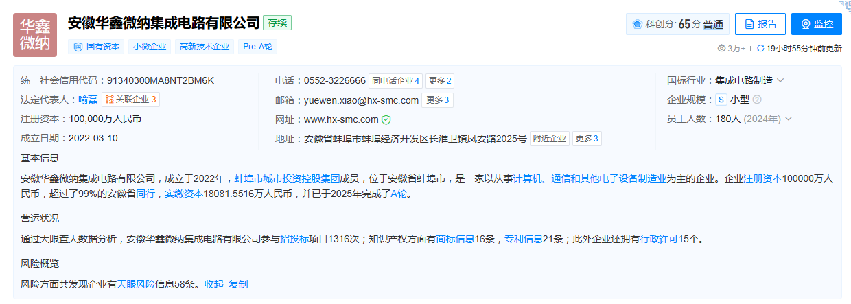 安徽华鑫微纳集成电路有限公司成立于2022年3月,法定代表人为喻磊,注册资本10亿人民币,经营范围含集成电路制造、集成电路芯片及产品制造、集成电路销售、集成电路芯片及产品销售、集成电路设计、集成电路芯片设计及服务、半导体器件专用设备制造等。股东信息显示,该公司现由蚌埠市成长型中小企业基金有限公司、安徽鑫研传感科技有限公司及上述新增股东等共同持股。