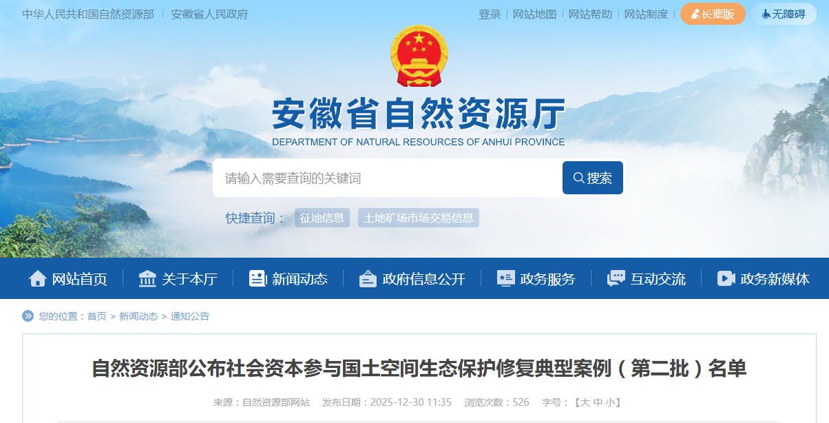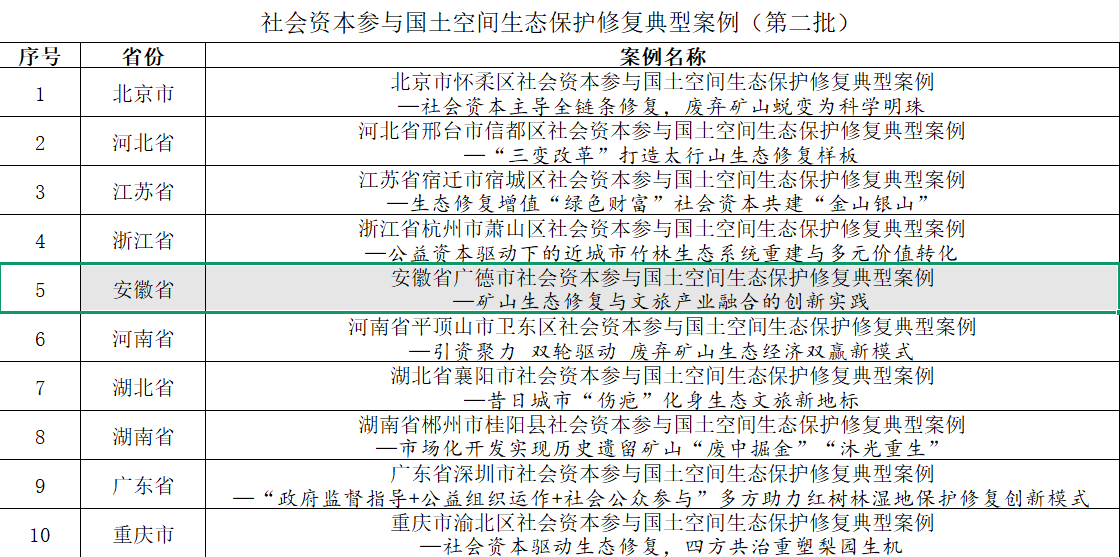 近日,自然资源部公布社会资本参与国土空间生态保护修复典型案例(第二批)名单。其中,安徽1例入选——安徽省广德市社会资本参与国土空间生态保护修复典型案例—矿山生态修复与文旅产业融合的创新实践。