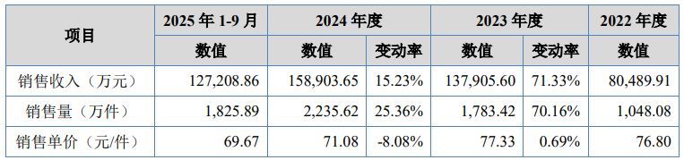 从收入构成来看,报告期内,杰锋动力汽车排气系统产品收入占比分别为 76.94%、82.37%、76.92%和 76.91%,是公司的主打产品。2023年至2025年前三季度,该产品销售价格连续下降,单价分别为77.33元/件、71.08元/件和69.67元/件,2025年前三季度的单价相比2023年全年下滑了大约9.91%。