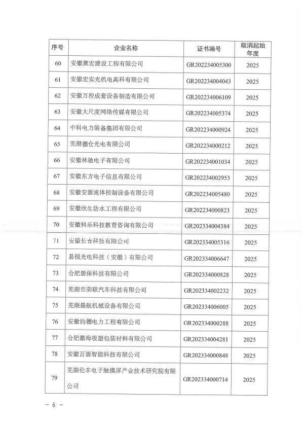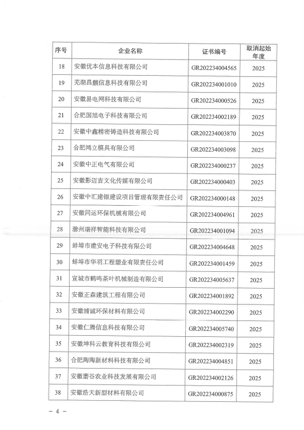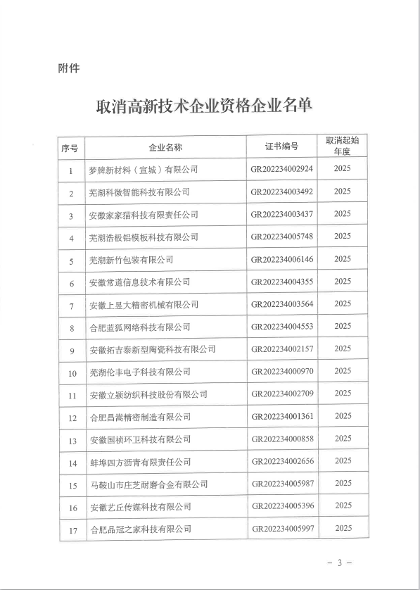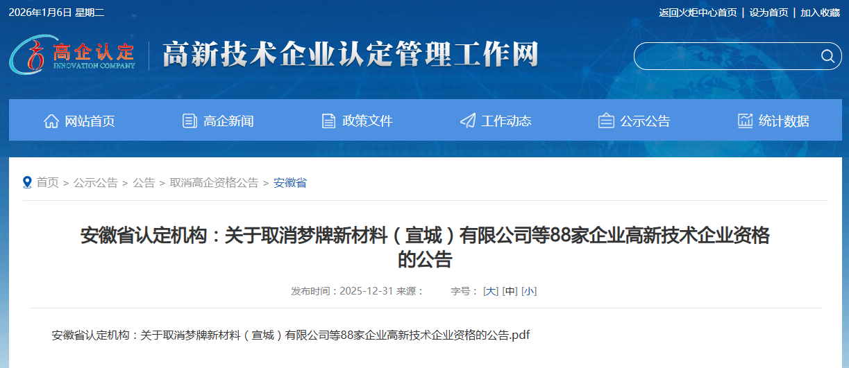 根据《高新技术企业认定管理办法》(国科发火〔2016〕32号)和《高新技术企业认定管理工作指引》(国科发火〔2016〕195号)相关规定,经研究,决定取消梦牌新材料(宣城)有限公司等88家企业高新技术企业资格。