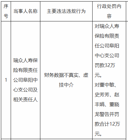 近日,据“国家金融监督管理总局安徽监管局”公开披露行政处罚信息,因财务数据不真实、虚挂中介,国家金融监督管理总局阜阳监管分局对瑞众人寿保险有限责任公司阜阳中心支公司罚款32万元,对相关责任人董中敏、史芳芳、赵丰娟、董晓龙警告并罚款合计12万元。