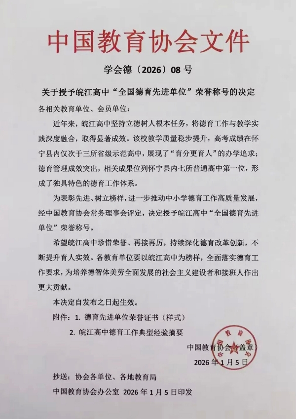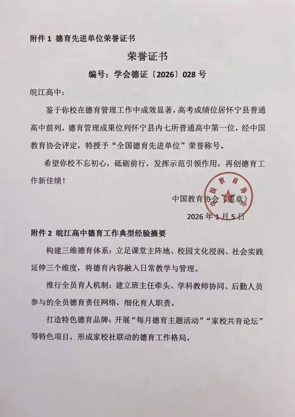 此项荣誉是对学校德育工作的肯定与鞭策。学校将以此为契机,持续深化育德育人实效,为培养全面发展的时代新人不懈奋进!(图文/安庆市皖江高中 操娟娟)