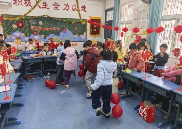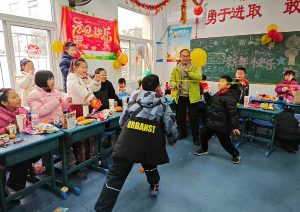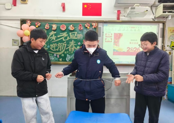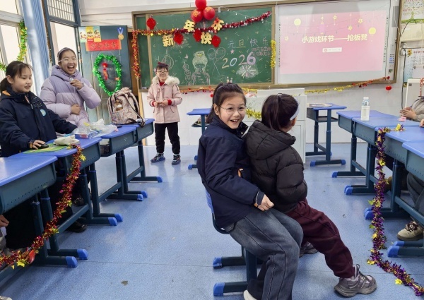 2025年12月31日上午,各班教室化身“欢乐营地”:黑板上“庆元旦 迎新春”的主题标语,搭配气球、彩带等装饰,洋溢着温暖氛围。课堂上,纸牌互动、绳子魔术、抢板凳、气球大战等游戏轮番上演。