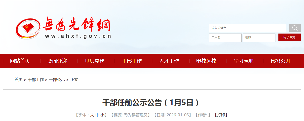 公示时间为2026年1月6日至2026年1月12日(上午8:00-12:00、下午2:30-5:30)。无为市委组织部安排专人值班并设立值班电话,听取干部群众意见。如发现上述人选在德、能、勤、绩、廉等方面存在问题,可以当面或用信函、电话以及登陆举报网站等形式向无为市委组织部反映,来信可寄无为市委组织部干部监督室收。