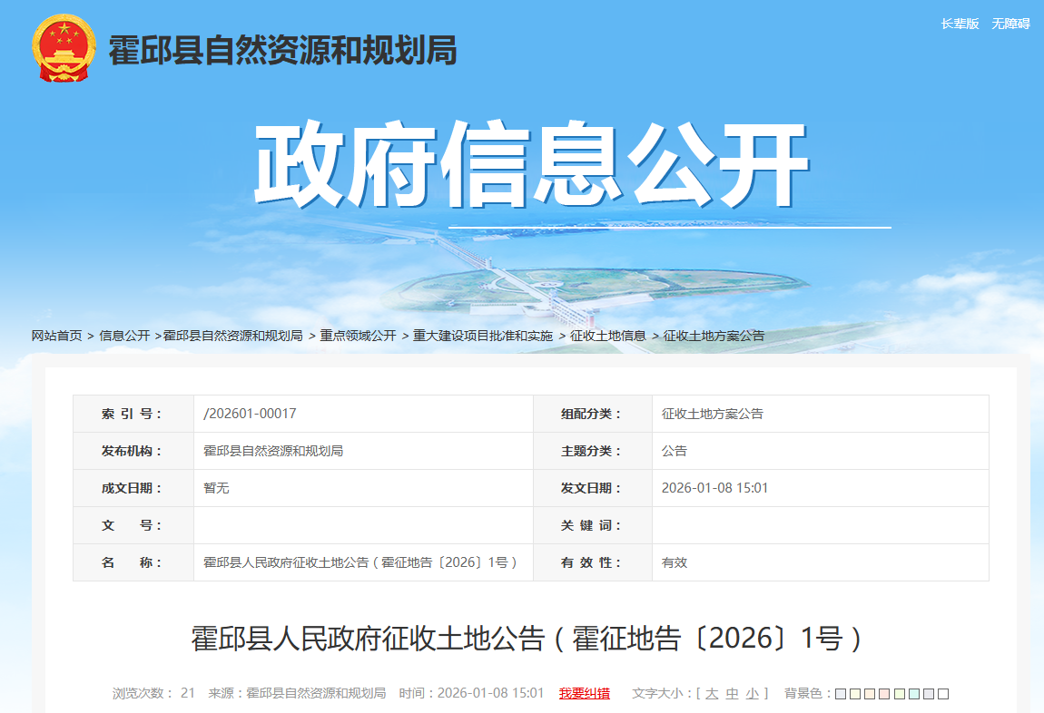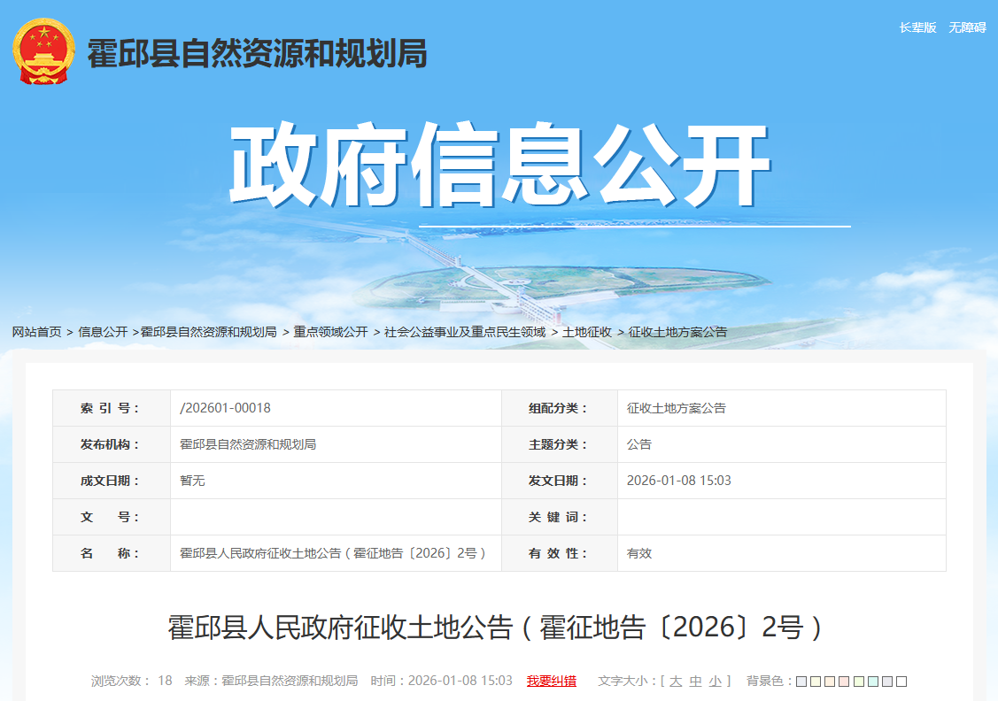 1月8日,霍邱县自然资源和规划局发布两则征收土地公告。
