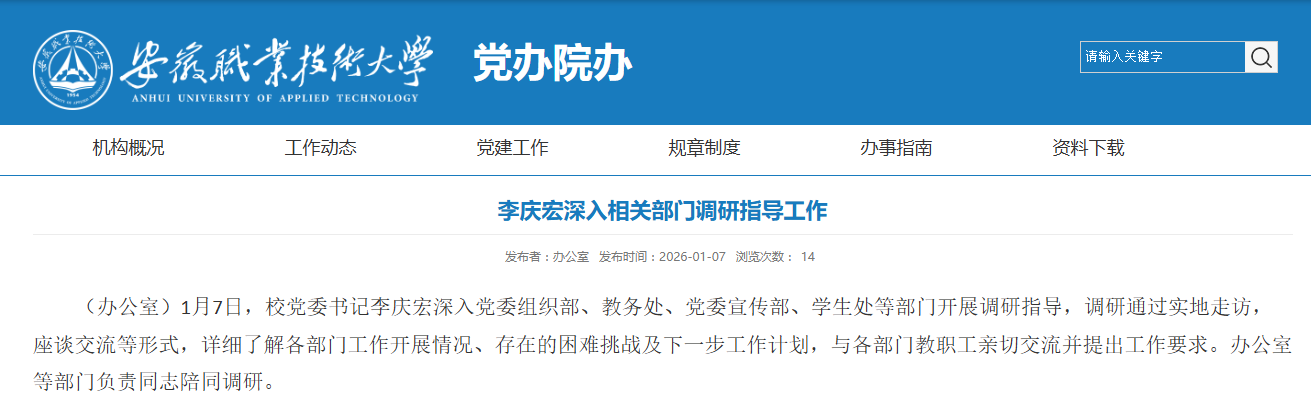 据安徽职业技术大学网站消息,1月7日,校党委书记李庆宏深入党委组织部、教务处、党委宣传部、学生处等部门开展调研。