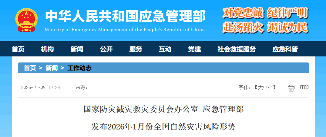 近日,国家防灾减灾救灾委员会办公室、应急管理部会同自然资源部、水利部、农业农村部、中国气象局、国家能源局、国家林草局等部门召开会商会,对2026年1月份全国自然灾害风险形势进行会商研判。
