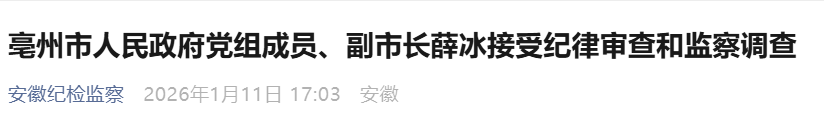 亳州市人民政府党组成员、副市长薛冰涉嫌严重违纪违法,目前正接受安徽省纪委监委纪律审查和监察调查。(安徽省纪委监委)