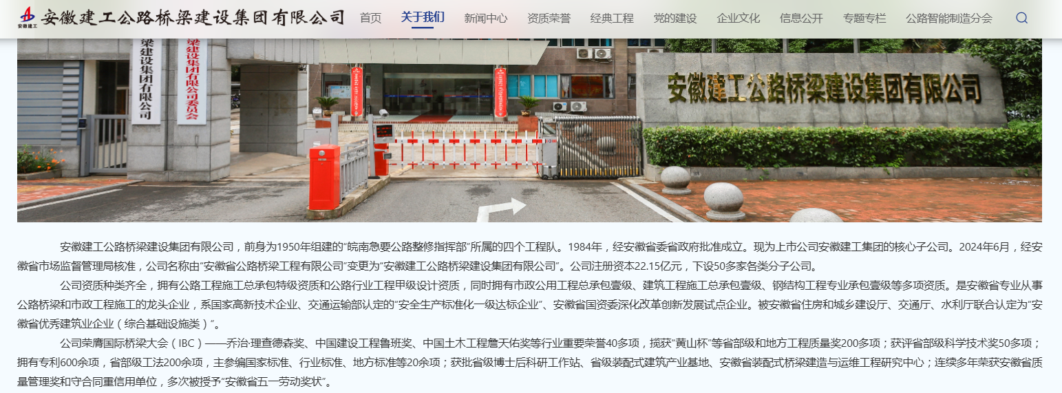 官网信息显示,安徽建工公路桥梁建设集团有限公司,前身为1950年组建的“皖南急要公路整修指挥部”所属的四个工程队。1984年,经安徽省委省政府批准成立。现为上市公司安徽建工集团的核心子公司。2024年6月,经安徽省市场监督管理局核准,公司名称由“安徽省公路桥梁工程有限公司”变更为“安徽建工公路桥梁建设集团有限公司”。公司注册资本22.15亿元,下设50多家各类分子公司。