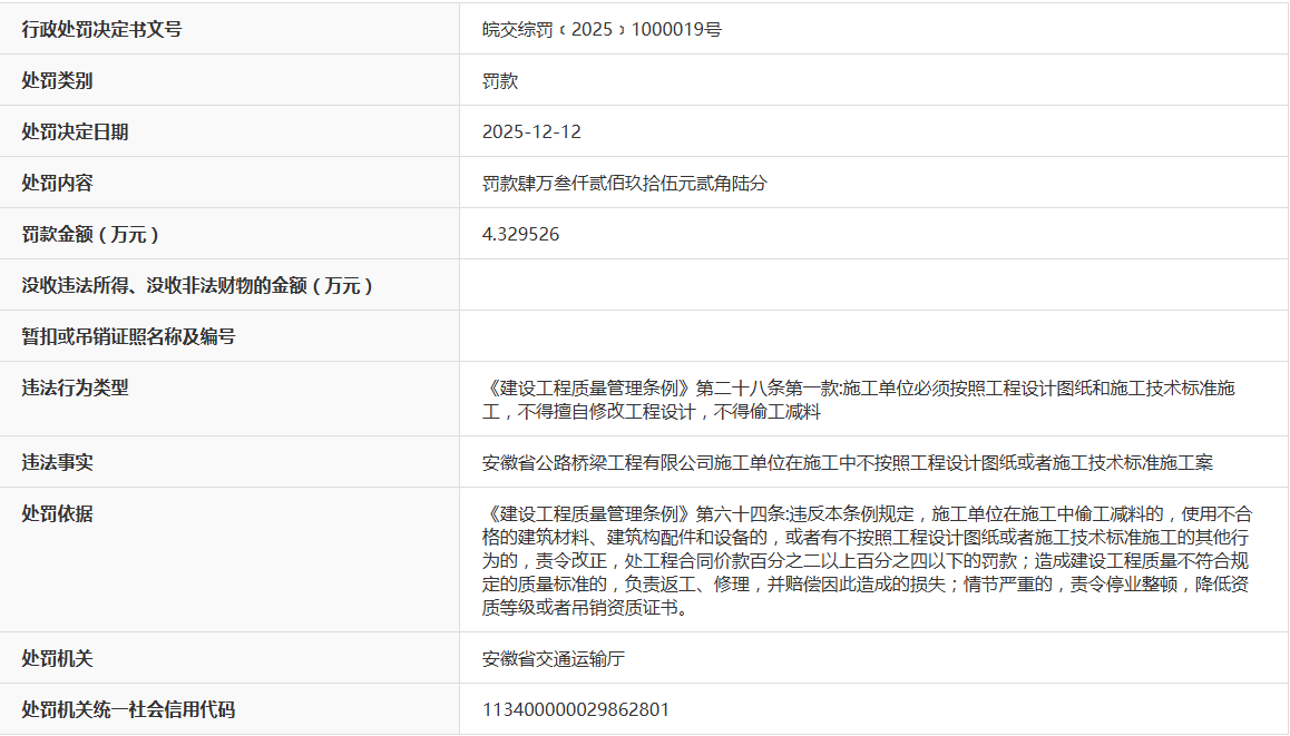 近日,据“信用安徽”公开披露行政处罚信息,因施工单位在施工中不按照工程设计图纸或者施工技术标准施工,安徽建工公路桥梁建设集团有限公司被处以罚款4.329526万元。行政处罚决定书文号是皖交综罚﹝2025﹞1000019号。