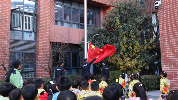 激昂的升旗乐曲奏响,淝河监狱民警迈着沉稳的步伐,带领安幼大班幼儿走向升旗台。孩子们身着整齐园服,专注地模仿民警昂首挺胸的姿态。在雄壮的国歌声中,五星红旗冉冉升起。民警神情庄重,孩子们也挺直腰板,目光追随着国旗缓缓上扬,爱国的种子在童真的心田悄然萌发。