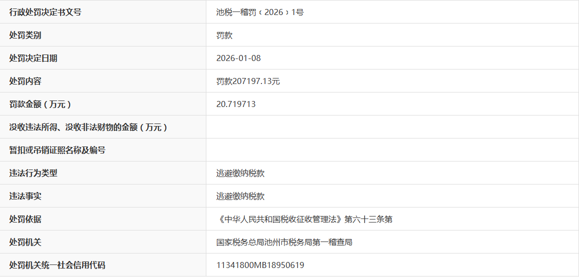 近日,据“信用安徽”公开披露行政处罚信息,因逃避缴纳税款,池州市海佳纺织科技有限公司被处以罚款20.719713万元。行政处罚决定书文号是池税一稽罚﹝2026﹞1号。