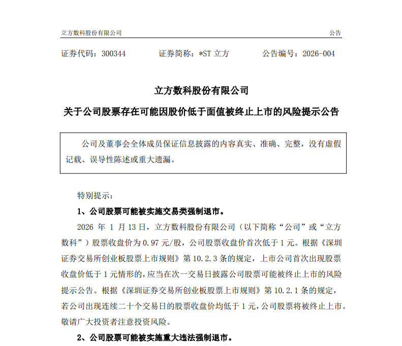 2026年1月13日,立方数科股份有限公司(以下简称“公司”或“立方数科”)股票收盘价为0.97元/股,公司股票收盘价首次低于1元。根据《深圳证券交易所创业板股票上市规则》第 10.2.3 条的规定,上市公司首次出现股票收盘价低于1元情形的,应当在次一交易日披露公司股票可能被终止上市的风险提示公告。根据《深圳证券交易所创业板股票上市规则》第10.2.1 条的规定,若公司出现连续二十个交易日的股票收盘价均低于1元,公司股票将被终止上市。敬请广大投资者注意投资风险。