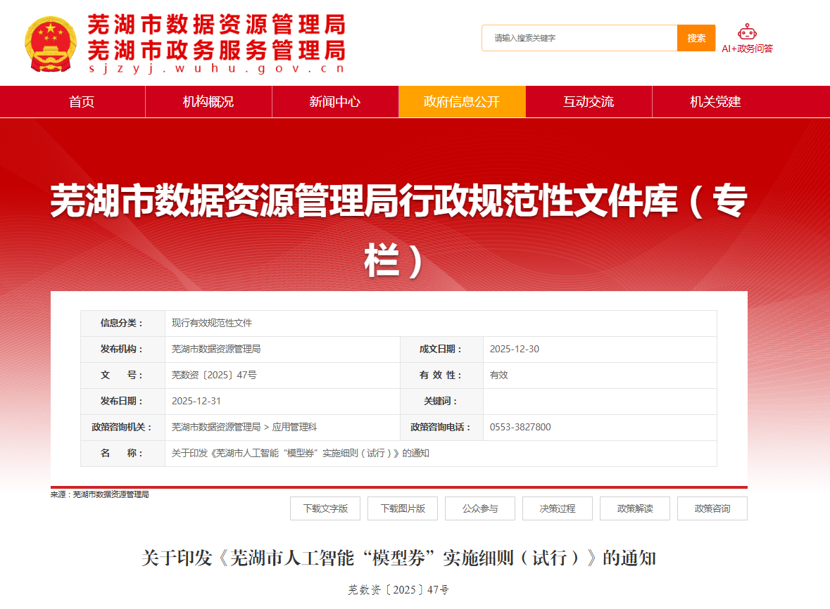 日前,芜湖市数据资源管理局发布《芜湖市人工智能“模型券”实施细则(试行)》,正式发放人工智能“模型券”,全年兑付总额最高2000万元,企业每年最高可申请200万元。