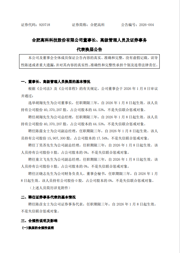 近日,合肥高科科技股份有限公司(下文简称“合肥高科”,920718.BJ)发布公告,公司选举胡翔为公司董事长,聘任胡翔为公司总经理,聘任陈茵、丁昊苏、童立飞为公司副总经理,聘任汪晓志为公司财务负责人、董事会秘书,聘任陈彦为公司证券事务代表,任职期限均为三年,自2026年1月8日起生效。