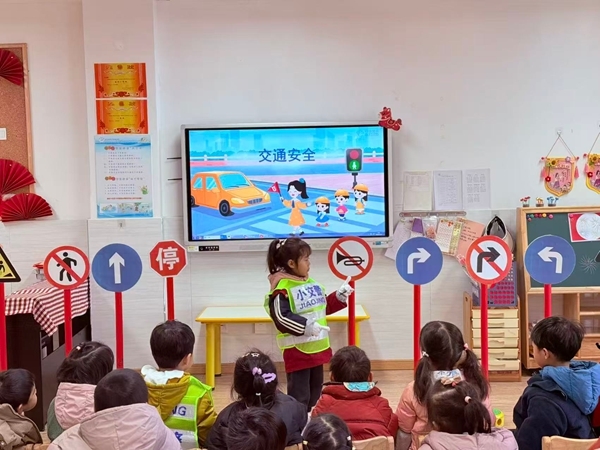 大班以“实践传播”为目标,让安全理念走出校园、辐射社区。孩子们化身“安全宣传员”,带着亲手制作的交通安全宣传画走进周边社区,向居民传递交通安全知识。园内开展的交通安全知识竞赛同样精彩纷呈,萌娃们化身“答题小达人”,在抢答、必答环节中沉着应对、激烈角逐,在趣味比拼中深化对交通规则的理解。