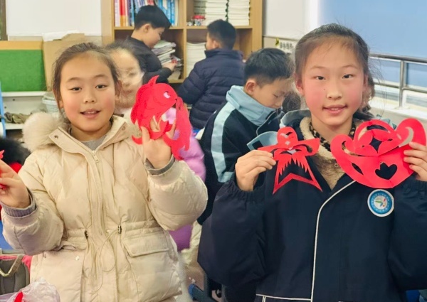暖意融融的四(1)班教室里,一场别开生面的剪纸课堂欢乐启幕。鲍梓瑄姑姑与王诚杰妈妈化身“非遗导师”,他们手持红纸与剪刀,耐心地向孩子们传授剪纸的技巧——从折叠纸张的角度,到勾勒图案的线条,再到裁剪时的力度把控,每一个步骤都讲解得细致入微。孩子们围在两位家长身边,眼神里满是好奇与期待,纷纷拿起工具动手尝试,在指尖的翻飞中,一张张普通的红纸渐渐变成了活灵活现的窗花、小动物,教室里不时响起惊叹声与欢笑声,传统文化的种子也在这动手实践的乐趣中悄然播撒。