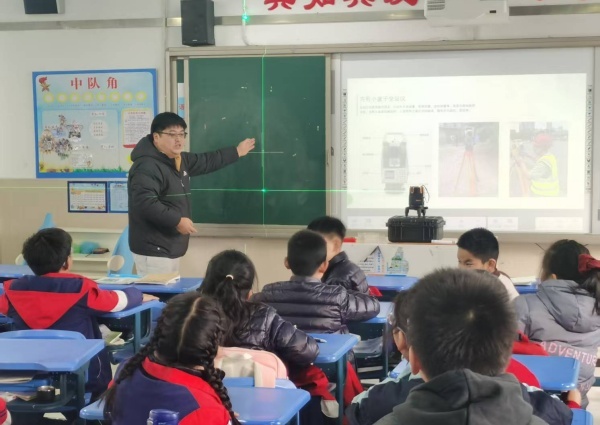 四(8)班邀请王金宸爸爸走进课堂,为同学们带来了一堂“工地测量工具”科普课。课堂上,激光投线仪、水准仪等专业工具化身“工程玩具”,同学们通过观察、操作,亲身体验测量黑板的长度、观测标杆的高度,感受科技在建设中的魅力。王金宸爸爸用生动比喻讲解工具原理及使用方法。他特别将话题引向数学,强调这门学科远不止于纸上的公式与计算。同学们听后深受启发,这堂别开生面的科普课,让抽象的数学知识变得可触可感,在同学们心中播下了探索科技、重视知识的种子,真正实现了“工地科技零距离”的生动体验。