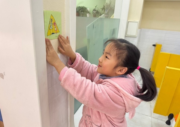 幼儿先在教师引导下认识生活中的安全标识,理解其防护价值,再化身“安全设计师”,以画笔将安全认知转化为创意标志,张贴于教室各处提醒同伴。这一过程让安全知识真正内化为幼儿的自觉行为,更培育了责任与规则意识,为幼小衔接的生活适应筑牢安全防线。