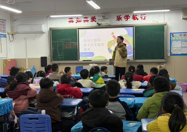 郑浩铭哥哥走进二(9)班,化身科普讲师,为同学们带来了关于航母的趣味分享。课堂上,郑浩铭哥哥借助精心准备的课件,从“辽宁舰——我们的第一艘航母”讲起,用通俗易懂的语言拆解航母的构造、功能,揭秘“海上巨无霸”的航行奥秘。航母图片与知识点讲解相互结合,牢牢抓住了孩子们的注意力,课堂氛围既专注又热烈。此次家长课堂的分享,不仅让孩子们拓宽了视野,更在他们心中埋下了热爱祖国、崇尚科学的种子。