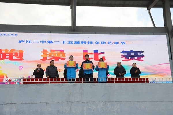 2026年1月12日下午,庐江二中第二十五届科技文化艺术节跑操比赛在田径场隆重举行。校党委副书记、校长杨应明亲临现场观赛指导,副校长罗会玲、苏春华等行管人员担任评委,全体学生以班级为单位参赛,用整齐的步伐和昂扬的姿态演绎青春风采。