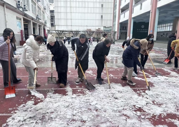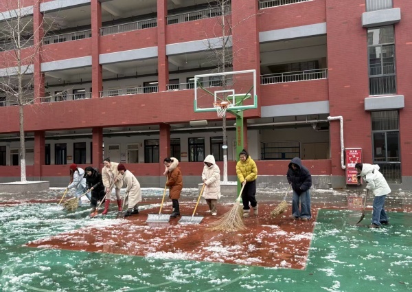 校党总支一声动员,三校区党员和积极分子齐响应。铁锹在手、扫帚在肩,众人迅速铺开在校园各处——校门前、台阶上、走廊边、跑道旁,铲冰、推雪、清道,动作利落,身影交错。雪屑飞扬中,一条条干净的小径渐渐显露。