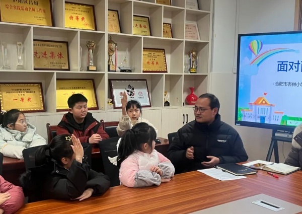 为扎实推进“四好三美化”学生文明素养培育专项行动,了解学校“十五五”规划拟定学生心声,2026年1月19日,合肥市杏林小学二楼会议室暖意融融,学校党支部书记、校长陈艳,党支部副书记黄楠,副校长刘建与各班级学生代表齐聚一堂,以真诚对话搭建沟通桥梁,让学生真正成为校园文化建设的小主人。