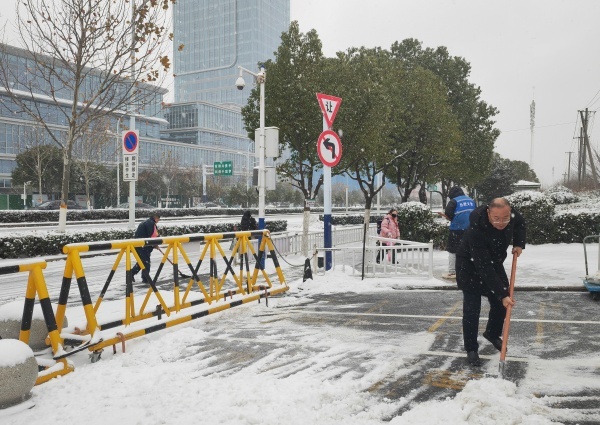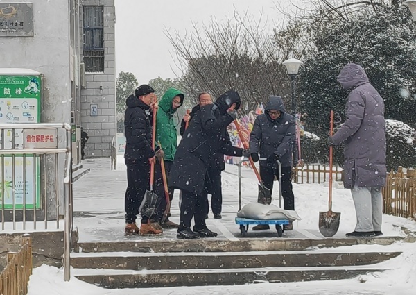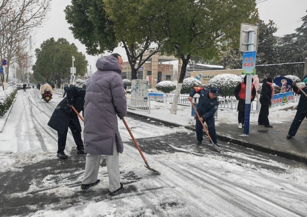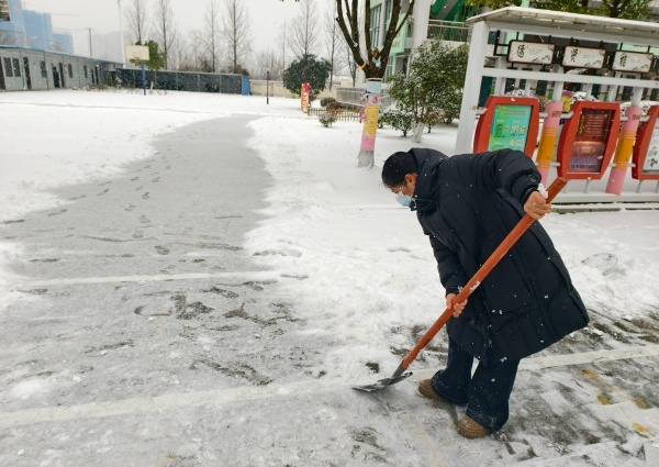 凛冽的寒风中,老师们分工协作、干劲十足,有的挥舞铁锹破冰铲雪,有的拿着扫帚清扫积雪,有的合力将成堆的积雪搬运至绿化带旁。尽管寒气逼人,大家的额头却渗出了汗珠,冻红的双手依旧不停挥动,忙碌的身影构成了雪后校园里一道温暖的风景线。