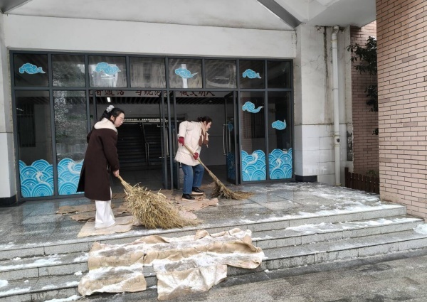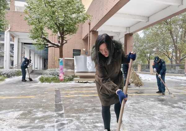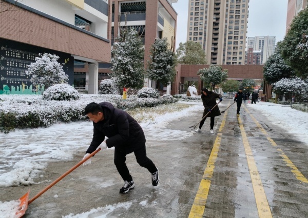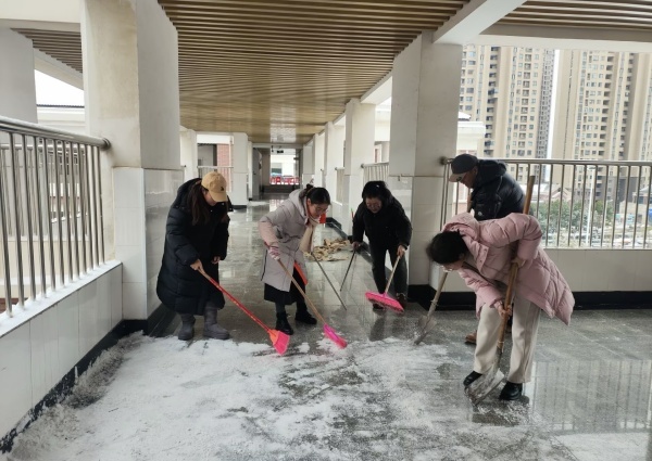 以雪为令,迎雪而战。学校党总支书记童乃梅,党总支副书记、副校长邢媛媛,副校长陈祥龙,带头冲锋,率领全体中层干部、党员教师及后勤人员手持铁锹、扫帚,投入清雪除冰工作。寒风中,大家分工协作、干劲十足,铁锹破冰声与扫帚清扫声交织成冬日里的护学乐章,即便手脸冻红,热情与效率丝毫不减。