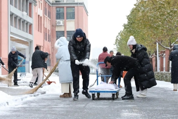 雪情就是命令,党员就是旗帜。清晨,校党总支第一时间发出倡议,四个党支部迅速行动,广大党员教师积极响应,闻雪而动。在划分好的责任区域内,党员教师们身先士卒,带头冲锋,手持铁锹、扫帚等工具,不畏严寒,分工协作。他们有的奋力铲除主干道上的厚冰,有的仔细清扫教学楼前的台阶积雪,有的则负责将积雪清运到指定地点。凛冽的寒风中,大家的脸冻得通红,手也因长时间握着冰冷的铁锹而麻木,但没有人退缩,没有人抱怨,现场一派热火朝天的景象。在党员教师的带动下,许多非党员教师也主动加入到清雪队伍中,让“志愿红”在白雪的映衬下显得格外鲜艳。
