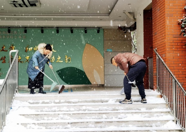 近日,合肥市突降瑞雪,为城市披上了银装素裹,也给校园安全带来了考验。为确保师生返校后的出行安全,合肥市南国花园小学党总支迅速行动,校党总支副书记、校长方红,挂任副书记钟德武,副校长吴正勇、黄华清等校领导带领党员干部及青年教师开展“扫雪除冰保畅通”志愿活动,为校园开辟出一条条“安全通道”。