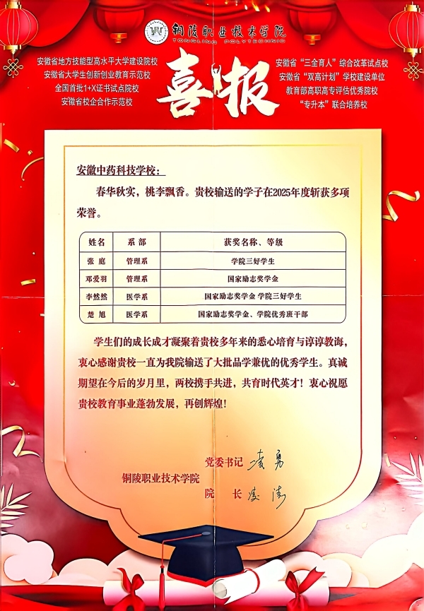 近日,铜陵职业技术学院向安徽中药科技学校发来喜报,祝贺安徽中药科技学校4名毕业学子在该校2025年度表现优异,荣获多项荣誉。