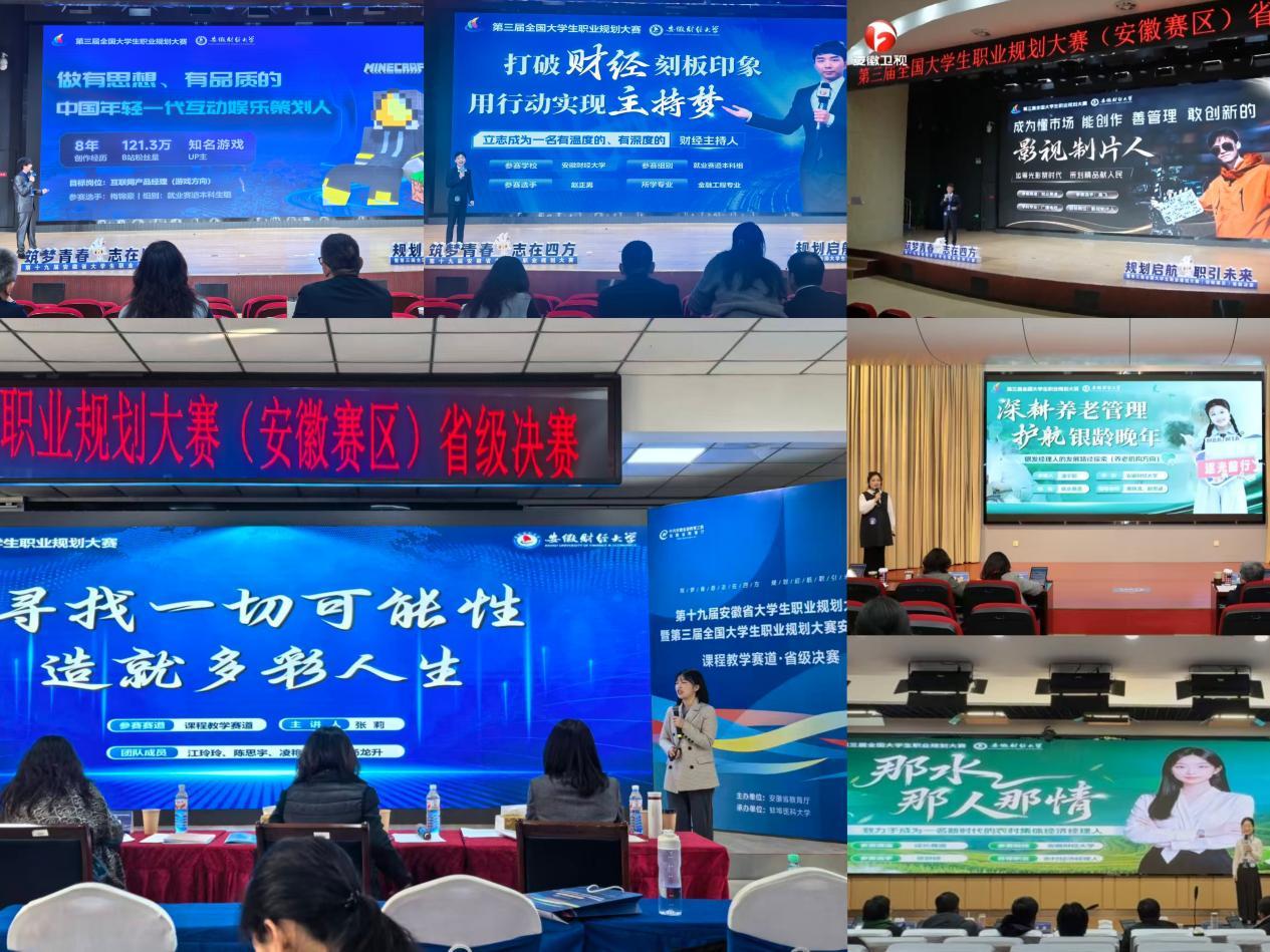 本次大赛吸引全省121所高校、99.64万名师生参与。安徽财经大学师生在各赛道奋勇争先,实现教学与学生赛道双金奖,充分展现出学校职业生涯教育的专业化。由安徽财经大学会计学院张莉主讲的《就业指导》课程教学团队(成员:江玲玲、陈思宇、凌艳、宗慧、汤龙升),凭借深厚教学积累、创新教学设计及精彩现场授课表现,从全省高校中脱颖而出,在课程教学赛道上斩获金奖。财政与公共管理学院梅锦豪斩获就业赛道本科生组金奖,以八年创作经历与行业洞察,展现复合型人才风采;艺术学院高飞获就业赛道研究生组银奖,立志影视制作书写时代光影;金融学院赵正男获就业赛道本科生组银奖,他凭借主持特长结合专业优势,规划财经主持发展之路;金融学院缪舒婷摘得成长赛道铜奖,聚焦“农村集体经济经理人”助力乡村振兴;工商管理学院潘宇阳在就业赛道研究生组获铜奖,瞄准“银发经济”,规划中医药智慧康养职业路径。六位选手的职业规划兼具多元追求与家国情怀,是学校育人成效的鲜活写照。