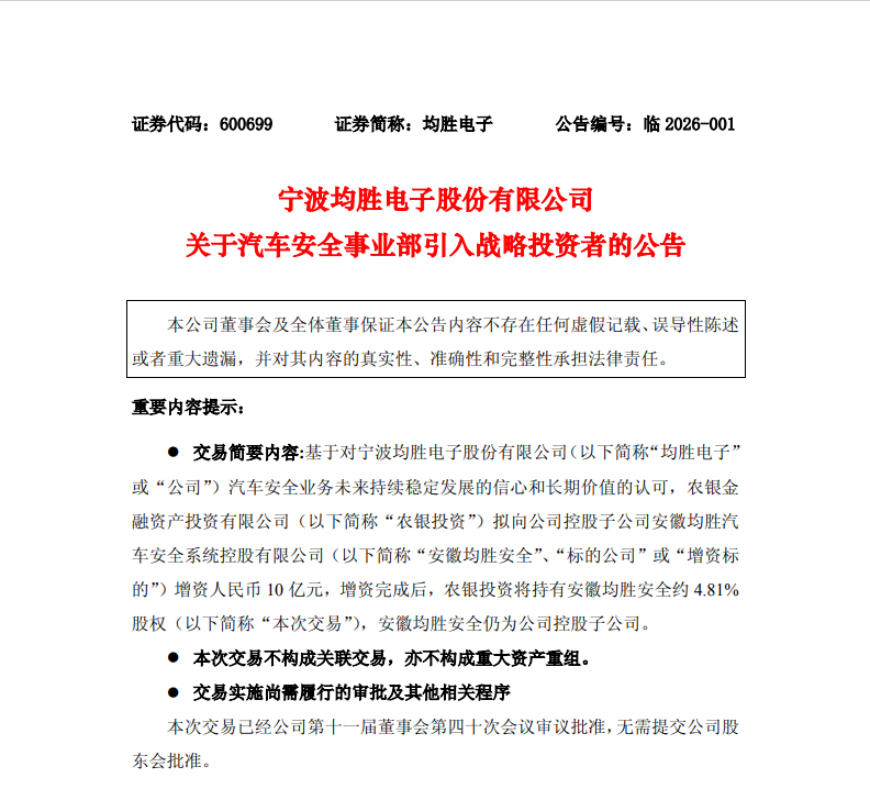近日,均胜电子(00699.HK,600699.SH)发布公告,农银金融资产投资有限公司拟向公司控股子公司安徽均胜汽车安全系统控股有限公司增资人民币10亿元,增资完成后,农银投资将持有安徽均胜安全约4.81%股权,安徽均胜安全仍为公司控股子公司。