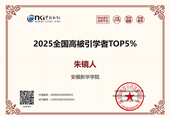 近日,中国知网中国科学文献计量评价研究中心公布了“2025中国知网高被引学者”名单,安徽新华学院大学生素质教育研究中心朱镜人教授入选“2025中国知网高被引学者”TOP5%,也是该校本次入选唯一人文社科类学者。