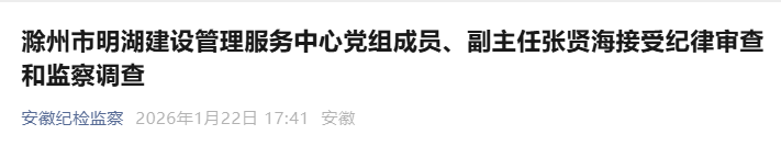 滁州市明湖建设管理服务中心党组成员、副主任张贤海涉嫌严重违纪违法,主动投案,目前正接受滁州市纪委监委纪律审查和监察调查。(滁州市纪委监委)