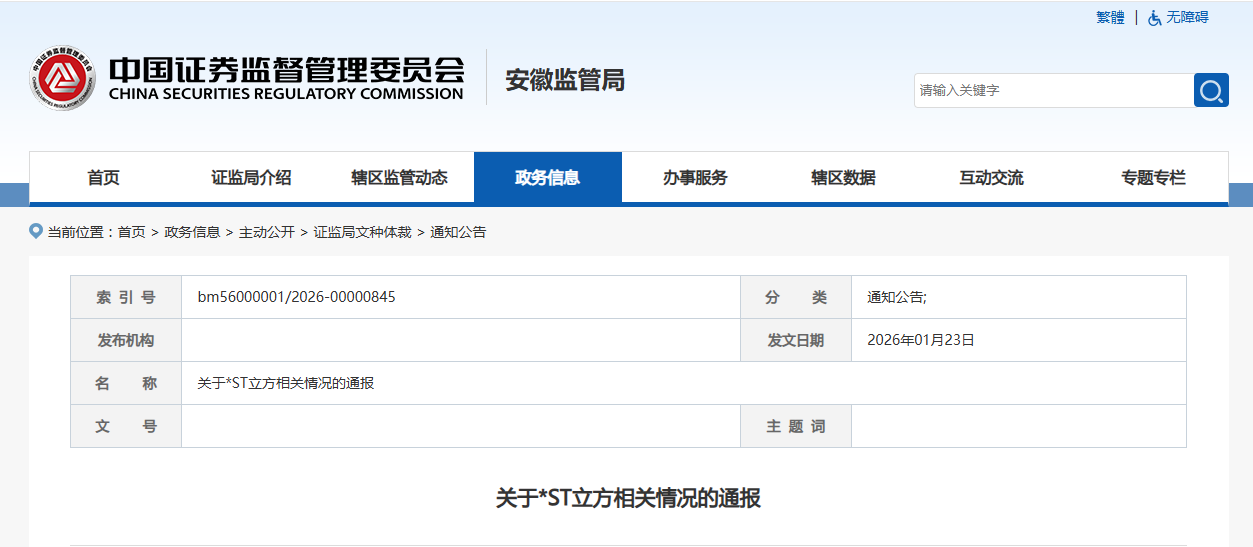 *ST立方因2021年、2022年、2023年连续三年年度报告财务数据涉嫌虚假记载,触及《创业板股票上市规则》关于重大违法强制退市情形的规定,公司股票可能被强制退市,我局已于2025年11月28日下发《行政处罚及市场禁入事先告知书》。拟处罚对象向我局提出延期申辩和听证的申请,我局已依法准予延期,目前正抓紧开展相关工作。后续,我局将依法做出行政处罚决定。