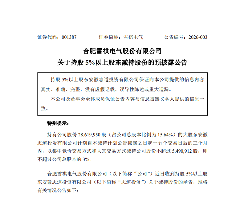 雪祺电气(001387.SZ)公告称,持股5%以上股东安徽志道投资有限公司因自身资金需求,计划通过集中竞价及大宗交易方式减持公司股份不超过549.09万股,占公司总股本的3%,其中集中竞价减持不超过1%,大宗交易减持不超过2%。减持期间为自公告披露之日起十五个交易日后的三个月内(即2026年2月12日-2026年5月11日)。股份来源为首次公开发行前持有的股份(含资本公积金转增股本取得的股份)。
