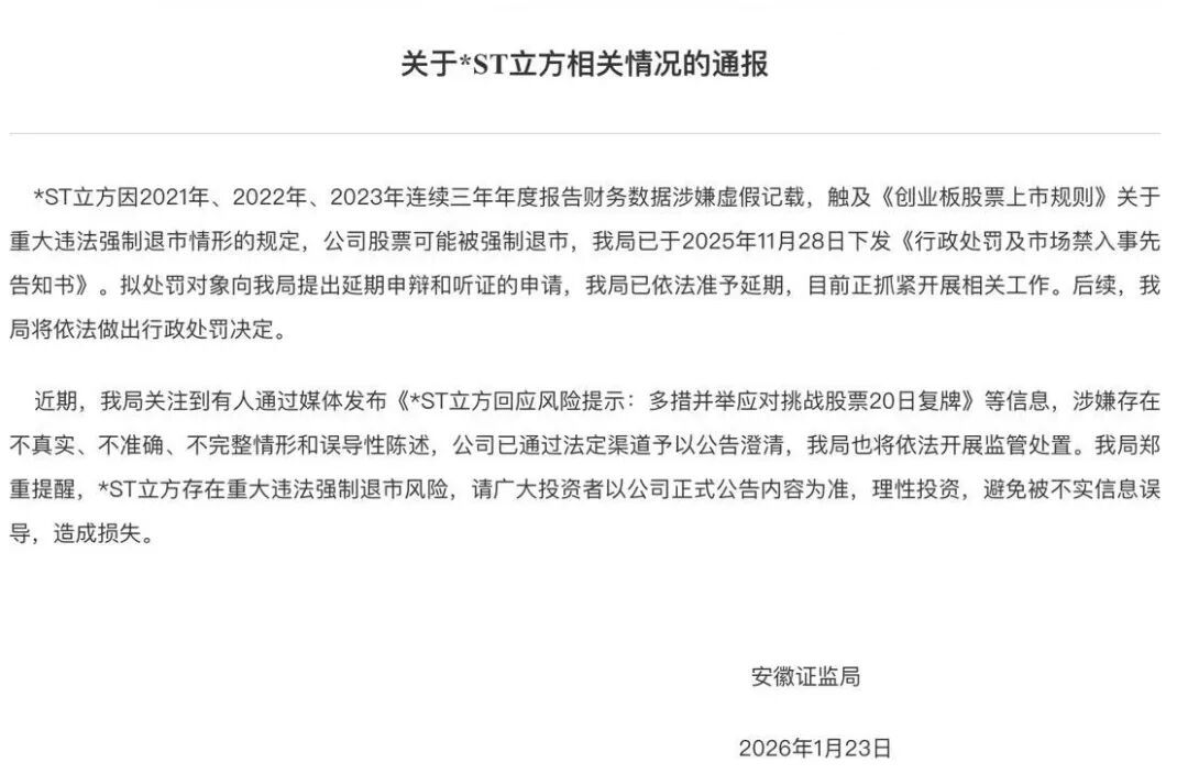 通报中提到,*ST立方因2021年、2022年、2023年连续三年年度报告财务数据涉嫌虚假记载,触及《创业板股票上市规则》关于重大违法强制退市情形的规定,公司股票可能被强制退市,安徽证监局已于2025年11月28日下发《行政处罚及市场禁入事先告知书》。拟处罚对象向安徽证监局提出延期申辩和听证的申请,安徽证监局已依法准予延期,目前正抓紧开展相关工作。后续,安徽证监局将依法做出行政处罚决定。